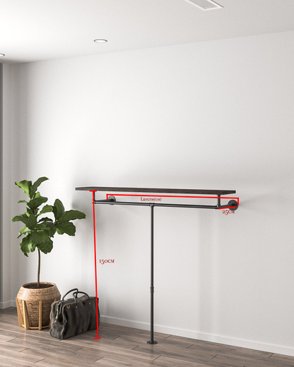 Retro wall-mounted hanging clothing rack, showcasing its design and capacity to hold many pieces of clothing.