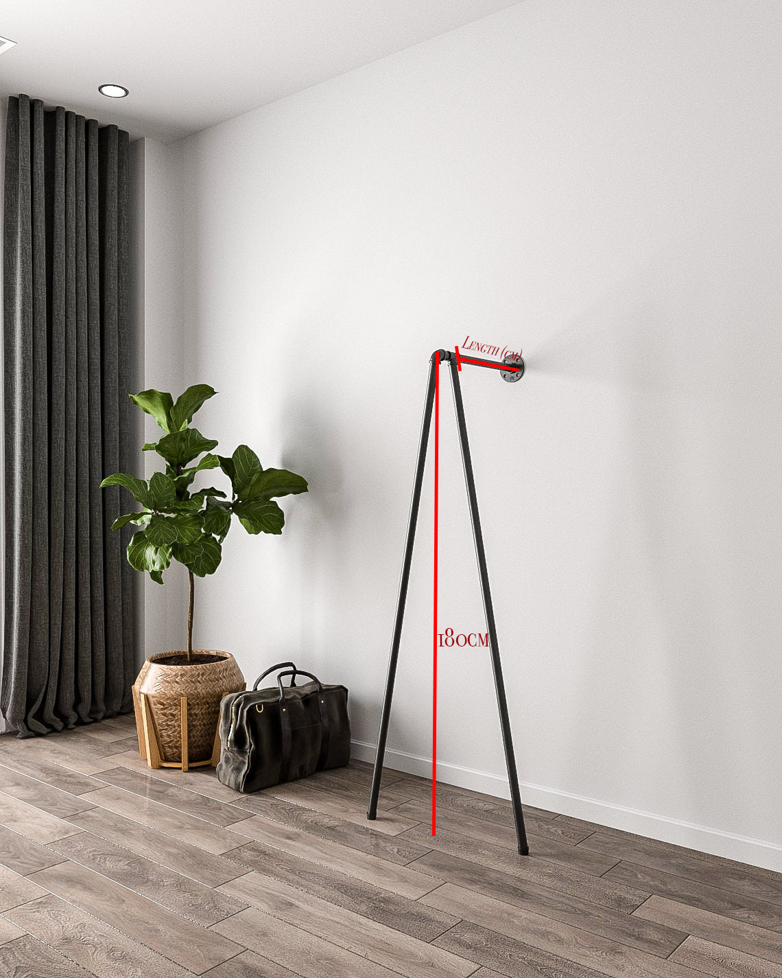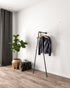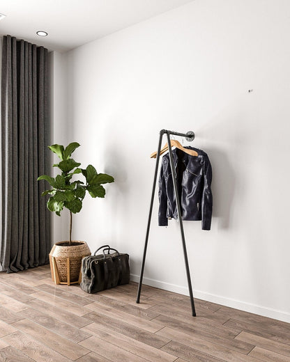 Iblu Clothes Rail, a wall-mounted and floor-supported industrial pipe clothes rail, showcasing its heavy-duty design."