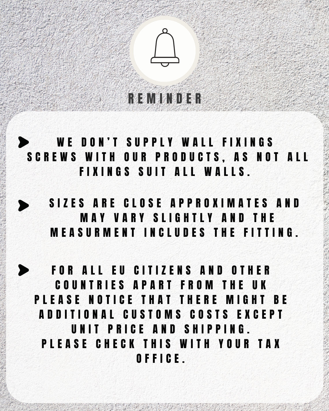 This product does not include wall fixings (i.e., screws) due to the variety of wall substrates it can be attached to. Also, sizes are close approximates and may vary slightly, and the length includes the fittings. If you have any questions regarding these, please message us, and we will be more than happy to help you out.