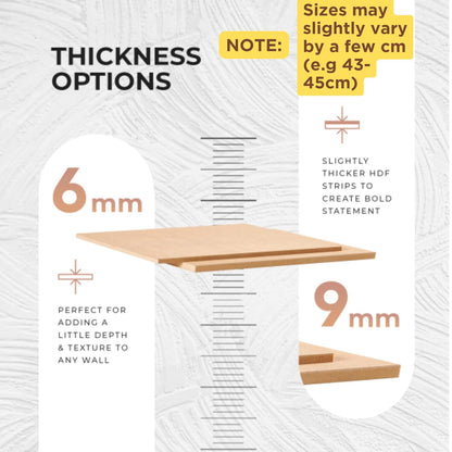 • Custom Sizes & Thickness Options: Enhance your interior with 3D wall panelling that creates a layered, dynamic look in any configuration you choose. Available in 6mm and 9mm thicknesses, these wooden strips can be easily tailored to fit your project requirements.
