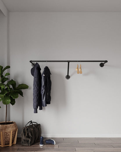 Sturdy malleable iron construction makes our Industrial Pipe Wall Mounted Clothing Racks durable and easy to assemble. Choose from sleek, modern, rustic, or vintage looks. Ideal for home, boutiques, retail stores, laundry rooms, etc.This rack holds many clothes and keeps them organized and tidy. Easy to mount on the wall and simple to assemble with detachable parts. Screw tight and mount in minutes.